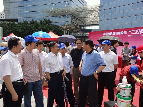 2012年4月29日上午在福田區的新城市廣場,由深圳市住房和建設局主辦“三打兩建”現場宣傳活動,市住房和建設局領導、市場監督管理局局長親臨現場、市工程質量監督總站、市建筑業協會、市防水協會領導高度重視,現場接受咨詢,此次活動得到了各企業、新聞媒體及廣大市民的積極響應。展示現場備受局領導和市民關注的有:“黑豹”牌聚合物水泥防水涂料(真、假品);防水卷材、結晶型防水材料(真、假品),還有燃器(具)、鋼筋、水泥、消防器材、安全設施及防護器具等。