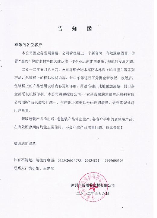 關(guān)于"黑豹"牌HB聚合物水泥防水涂料(JS-II型)包裝標(biāo)貼修改告知函