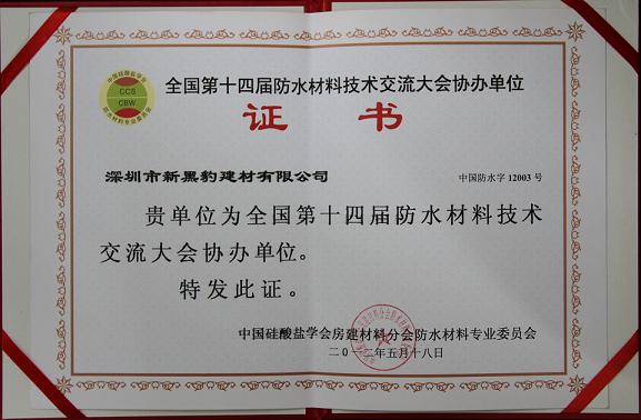 第十四屆全國防水材料技術交流大會(以下簡稱為“大會”)由中國硅酸鹽學會房建材料分會防水材料專業委員會主辦。本大會于2012年5月18—20日在重慶市貴僑酒店隆重召開,出席了此交流大會的近400名代表分別來自全國各地有關建筑防水堵漏生產、科研、檢測、施工、管理、社團組織等300多個單位。本次大會由中國中材集團蘇州非礦院防水材料設計研究所等6家公司共同承辦,由深圳市新黑豹建材有限公司等22家單位協辦,并得到了其他19家單位的支持。本公司在大會期間,獲得了中國硅酸鹽學會房建材料分會防水材料專委會的頒發的“全國第十四屆防水材料技術交流大會協辦單位”的證書。