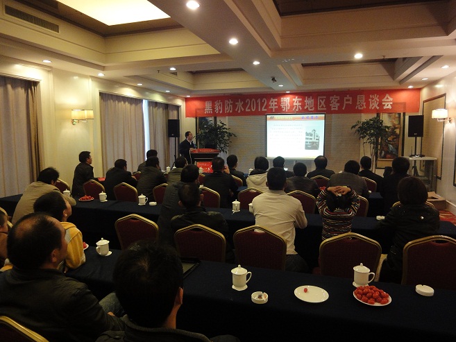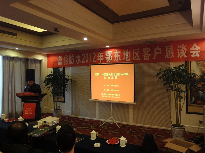 2012年11月10日,深圳市新黑豹建材有限公司在湖北黃梅地區總經銷的大力支持下,成功地在黃梅世紀錦園大酒店召開了2012年鄂東地區客戶懇談會。會議由深圳市新黑豹建材有限公司黃梅總經銷吳志高總經理主持,我公司董事長王榮柱先生首先介紹了公司目前的發展情況及公司產品的情況。在會上,我公司還通過宣傳短片的形式向參會的客戶介紹了公司產品的外觀特征及防偽查詢方法。與會的經銷商代表們還觀看了深圳電視臺關于工商部門查處假冒“黑豹”牌防水涂料的相關報道及《聚合物水泥防水涂料室內防水工程防水施工工藝及質量控制》相關短片。