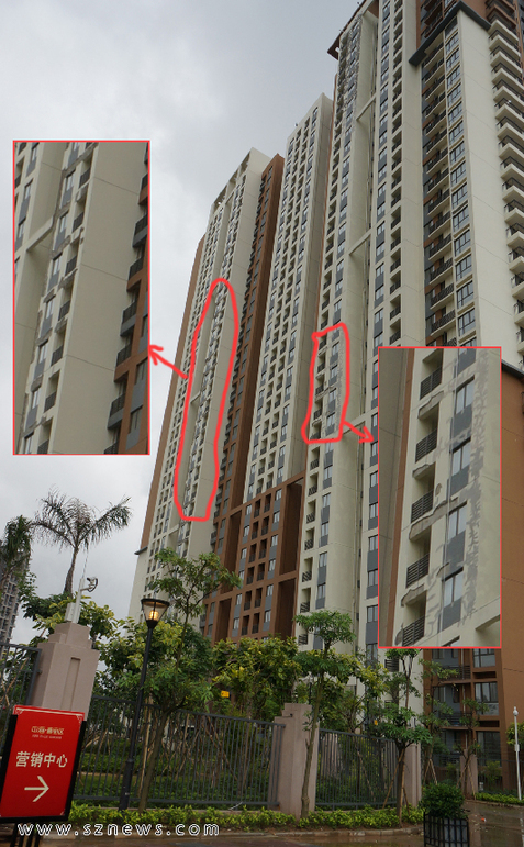 深圳新聞網7月26日訊(記者 王丹丹)安居房項目中海閱景花園存在質量問題?近日,有不少網友在深圳各大論壇反映(點擊進入貼文),深圳安居房中海閱景花園項目外墻嚴重脫落,7月25日記者在現場發現,閱景花園4棟塔樓均存在不同程度的外墻脫落,最嚴重的部分從一樓到頂樓均有脫落現象。
