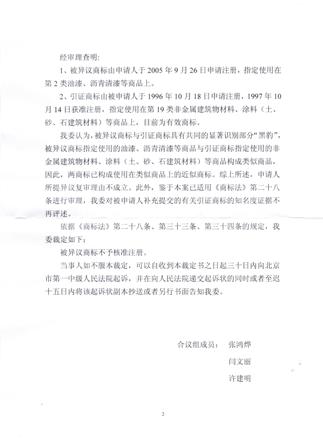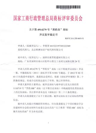 國家工商行政管理總局商標評審委員會認為“黑豹皇”商標指定使用的油漆、瀝青清漆等商品與我公司“黑豹”商標指定使用的非金屬建筑物材料、涂料(土、砂、石建筑材料)等商品構成類似商品,并依據《商標法》第二十八條、第三十三條、第三十四條的規定,國家工商行政管理總局商標評審委員裁定“黑豹皇”商標不予核準注冊。