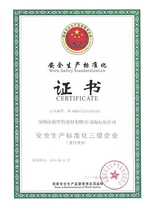 一直以來,我公司把安全生產和產品質量都放在首位,我們不斷地規范生產流程,改善工作環。通過多次審核,我公司的位于深圳的生產基地深圳市新黑豹建材有限公司南山分公司被評為安全生產標準化三級企業。