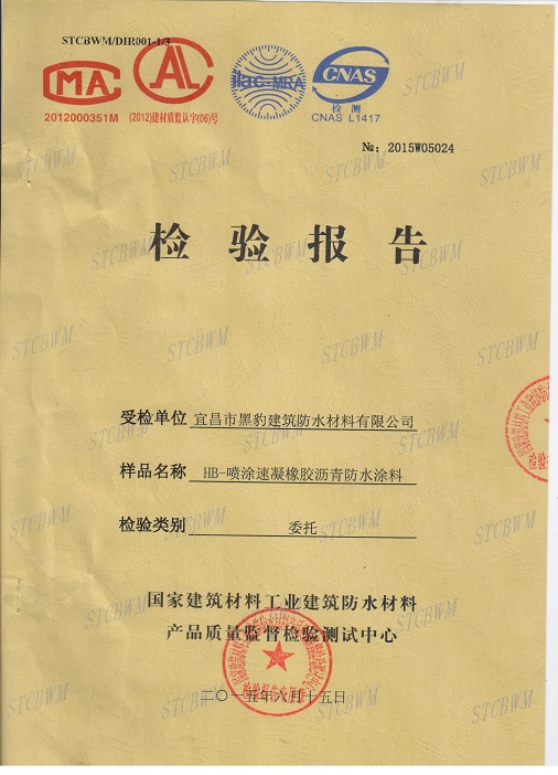 我公司研發(fā)的HB噴涂速凝橡膠瀝青防水涂料,現(xiàn)已委托我公司的控股子公司宜昌市黑豹建筑防水材料有限公司生產(chǎn)并委托國(guó)家建筑防水材料產(chǎn)品質(zhì)量監(jiān)督檢驗(yàn)測(cè)試中心按照我公司企業(yè)標(biāo)準(zhǔn)進(jìn)行了型式檢驗(yàn)。現(xiàn)檢測(cè)結(jié)果均符合我公司的企業(yè)標(biāo)準(zhǔn)。