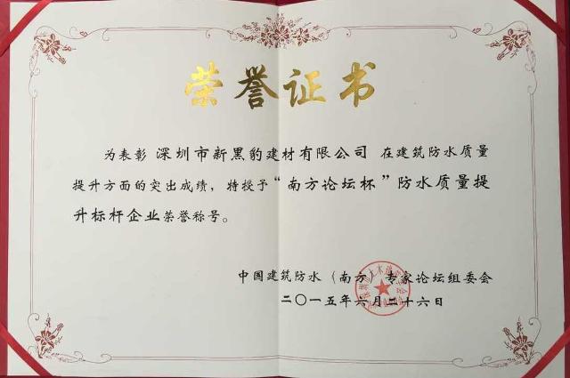 2015年6月27日,“第四屆建筑防水(南方)專家論壇”在深圳市五洲賓館召開。本次論壇由中國建筑防水協會、中國建筑防水專家委員會主辦。在本次會議中,我公司被授予“南方論壇杯”防水質量提升標桿企業。