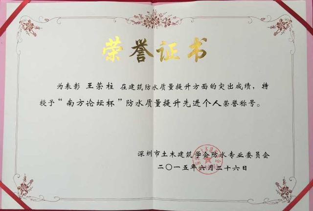 2015年6月27日,“第四屆建筑防水(南方)專家論壇”在深圳市五洲賓館召開。本次論壇由中國建筑防水協會、中國建筑防水專家委員會主辦,由深圳市土木建筑學會防水專業委員會、深圳建筑防水專家委員會承辦。在本次會議中,我公司董事長王榮柱被授予“南方論壇杯”防水質量提升先進個人稱號。