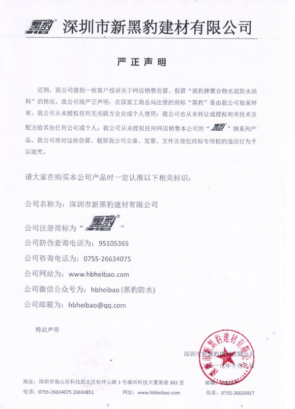 公司防偽查詢電話為:95105365 公司咨詢電話為:0755-26634075 公司網(wǎng)站為:www.buypro.com.cn 公司微信公眾號(hào)為:hbheibao (黑豹防水) 公司郵箱為:hbheibao@qq.com 特此聲明 深圳市新黑豹建材有限公司 二0一九年十月八日