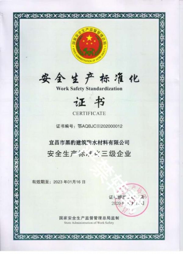 正當人們手捧豐收碩果送走了2019年;正當人們滿懷豪情闊步邁進2020年;正當人們在黨中央英明領導下,團結一心眾志成城戰勝瘟疫,取得了決定性的勝利;正當東西南北中各條戰線各族人民信心百倍斗志昂揚,按照要求分批次有步驟地復工復產;就在春風楊柳萬千條,億萬人民盡舜堯 ,紅雨隨心翻作浪,青山著意化為橋,山花爛漫迎春天的時節,深圳市新黑豹建材有限公司宜昌生產基地------宜昌市黑豹建筑防水材料有限公司傳來喜訊,企業安全生產標準化已驗收達標,并榮獲國家安全生產監督管理總局證書。